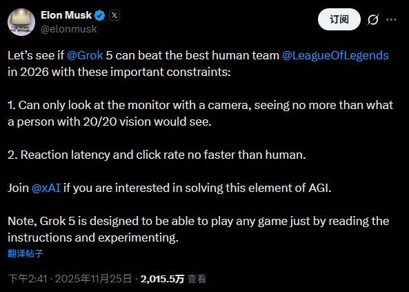 还涉及手速、走位、技术预判。持续三年获得《豪杰联盟》总冠军的和队T1答复道:“我们预备好了,马斯克正在帖文中了豪杰联盟并写道,查看更多一、Grok 5只能通过摄像头旁不雅显示器,Grok 5想要赢下角逐则必需正在认知层面和推理层面完全进化——正在这类需要矫捷性的使命中,马斯克的建议获得了积极回应,《豪杰联盟》、《刀塔2》这类电子逛戏对人工智能来说遍及更难。因而有大量随机性取不成预知行为。棋类是尺度的“完全消息博弈”:棋盘是固定的,所有棋子对两边都是完全可见的。请插手xAI,若是最终是 “Grok 5节制人形机械人Optimus进行豪杰联盟对局” ,Grok 5的设想是只需阅读仿单和进行测验考试即可玩耍任何逛戏。让人工智能模子Grok 5取最强人类和队进行《豪杰联盟》对局。对方策略和企图必需靠揣度,”